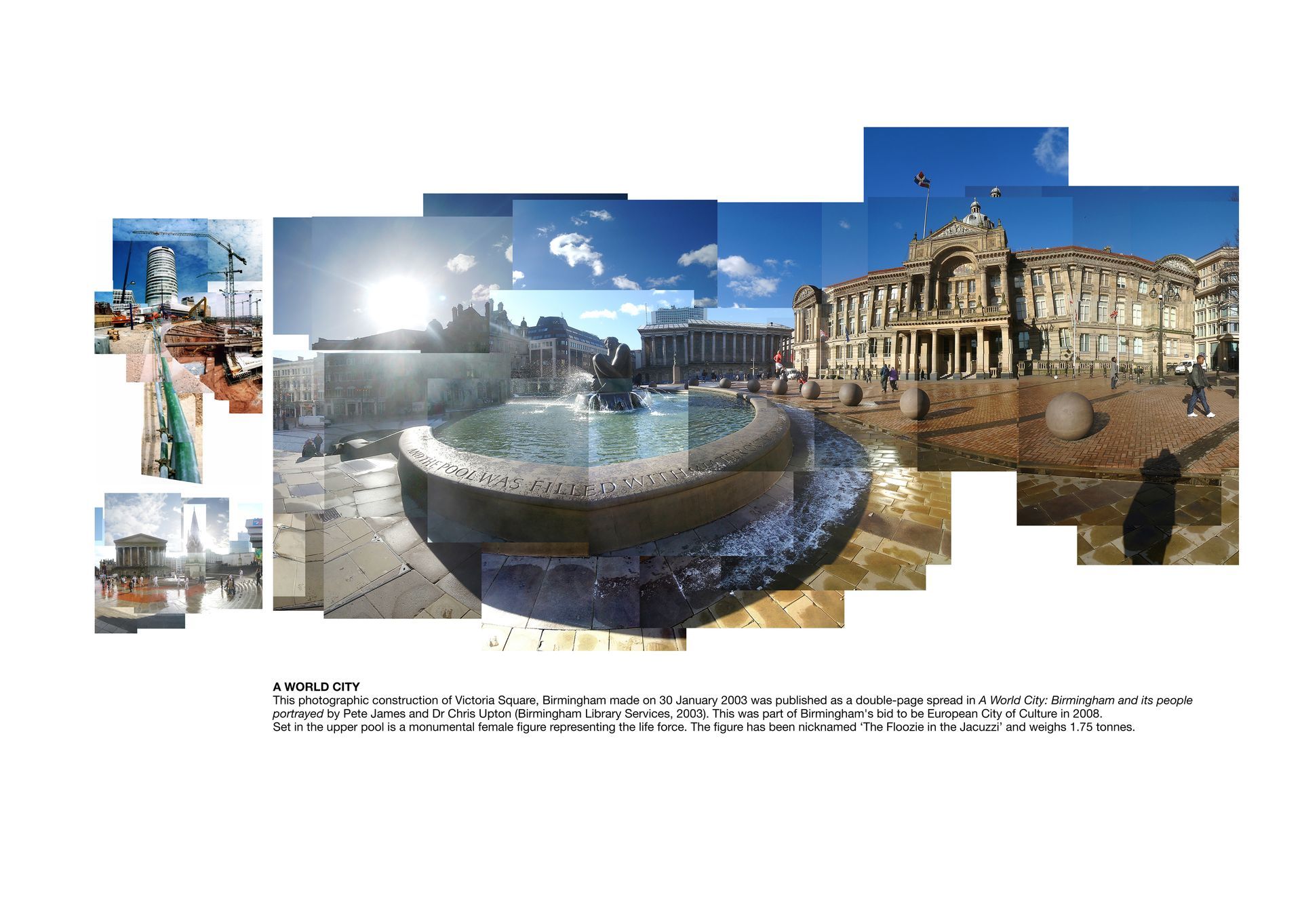 This photographic construction of of Victoria Square, Birmingham made on 30 January 2003 was published as a double-page spread in A World City: Birmingham and its people portrayed by Pete James & Dr Chris Upton (Birmingham Library Services, 2003). This was part of Birmingham's bid to be te European City of Culture in 2008 and is a marker for photography and Birmingham at that time.